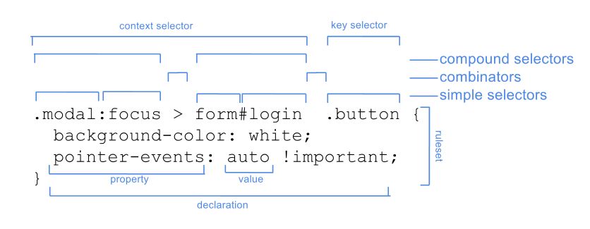 : Here's the (mostly) official names of many common CSS syntax bits.