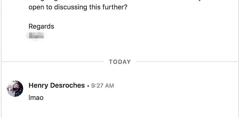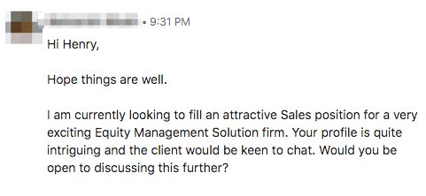 Lot to unpack here but what I'd like to focus on primarily is that A. homie saw my LinkedIn and was like "that's an attractive salesperson" and B. homie said "very exciting" and "equity management solution firm" in the same sentence like I was just gonna let that slide.