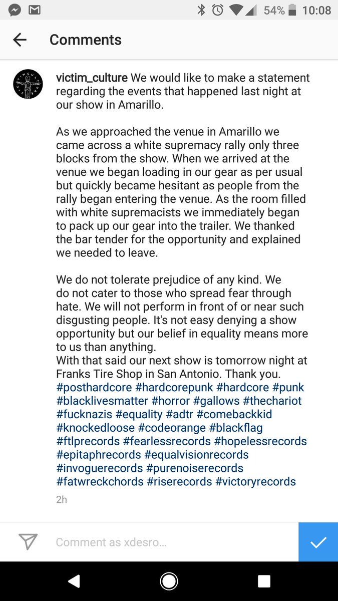 2017 Aug 21 Dude @victim_culture puts their money where the mouth is. No room in the scene for nazis 🙏